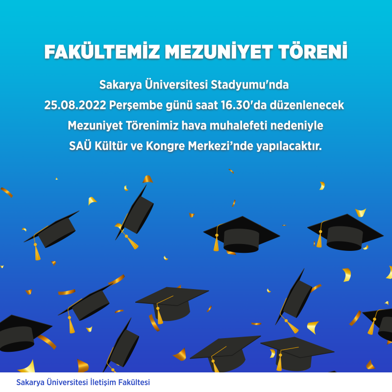 Sakarya Üniversitesi Stadyumu'nda 25.08.2022 Perşembe günü saat 16.30'da düzenlenecek Mezuniyet Törenimiz hava muhalefeti nedeniyle SAÜ Kültür ve Kongre Merkezi’nde yapılacaktır.