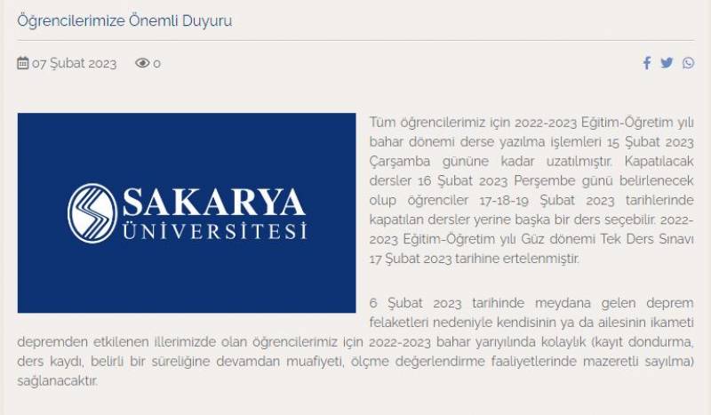 6 Şubat 2023 tarihinde meydana gelen deprem felaketleri nedeniyle kendisinin ya da ailesinin ikameti depremden etkilenen illerimizde olan öğrencilerimiz için 2022-2023 bahar yarıyılında kolaylık (kayıt dondurma, ders kaydı, belirli bir süreliğine devamdan muafiyeti, ölçme değerlendirme faaliyetlerinde mazeretli sayılma) sağlanacaktır.