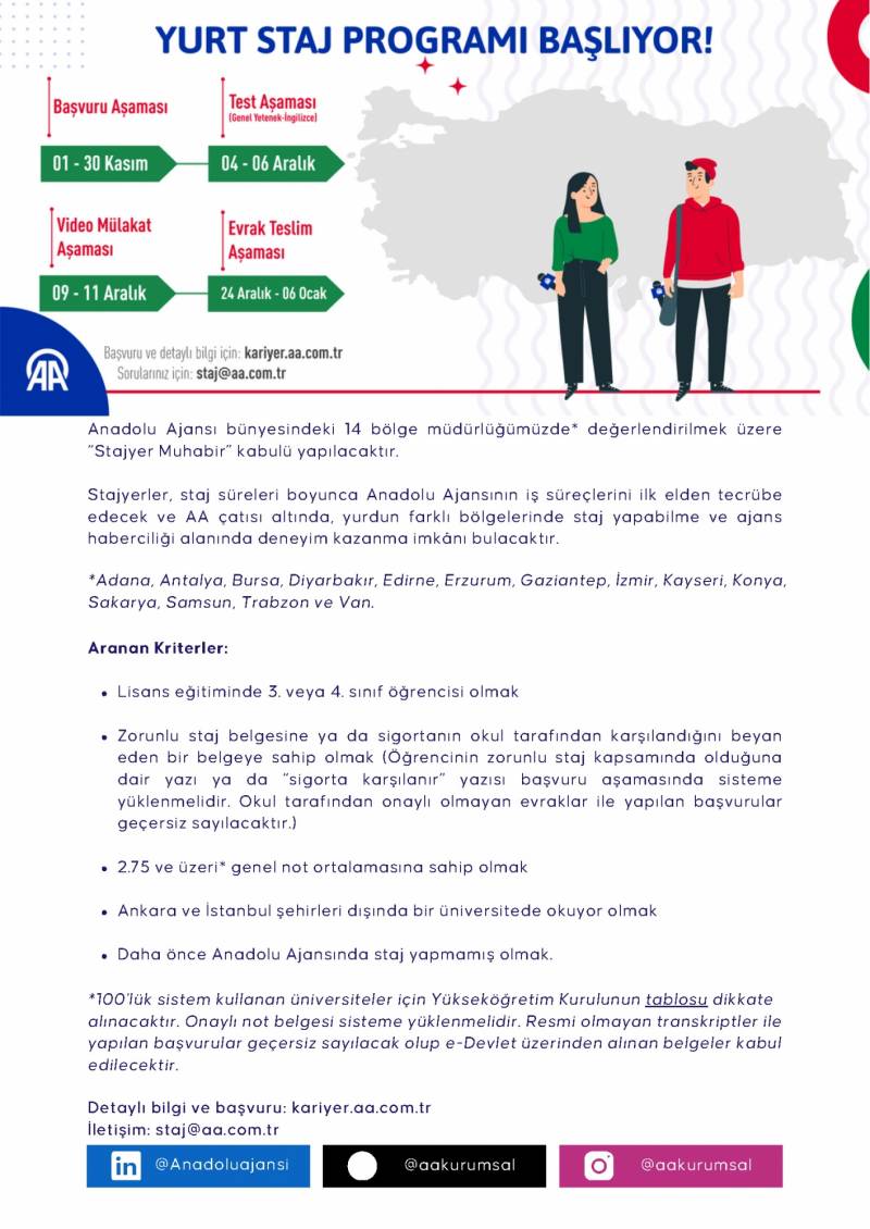 Anadolu Ajansı (AA), Ankara, İstanbul ve çeşitli bölge müdürlüklerinde farklı birimlerde görevlendirilmek üzere 2024 kış dönemi için stajyer alımı yapacaktır. Stajyerler, AA’nın iş süreçlerini ilk elden deneyimleme ve ajans haberciliği ile idari alanlarda uzmanlık kazanma fırsatına sahip olacaklardır. Ajans Staj Programı ve Yurt Staj Programı hakkında detaylı bilgiye kariyer.aa.com.tr internet sitesinden ve ekli dosyalardan ulaşılabilir.