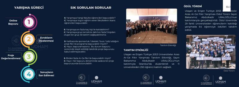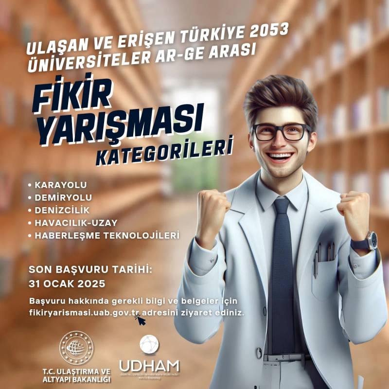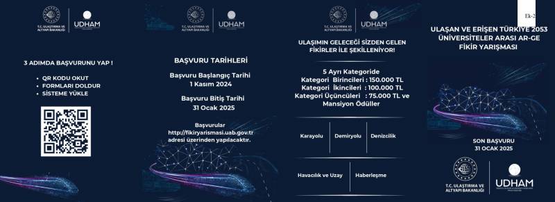 Ulaştırma ve Altyapı Bakanlığı, Ulaştırma Denizcilik ve Haberleşme Araştırmaları Merkezi Başkanlığı (UDHAM) tarafından ikincisi düzenlenecek olan "Ulaşan ve Erişen Türkiye 2053 Üniversiteler Arası Ar-Ge Fikir Yarışması"na ilişkin proje fikri başvuru süreci, 1 Kasım 2024 tarihi itibari ile başlamıştır. Detaylı bilgiye Ulastırma ve Altyapı Bakanlığı'nın "UDHAM" Başkanlığı "udham.uab.gov.tr" sayfasından ulaşılabilir. Proje fikri başvuruları "fikiryarismasi.uab.gov.tr" adresinden çevrimiçi olarak gerçekleştirilecektir
