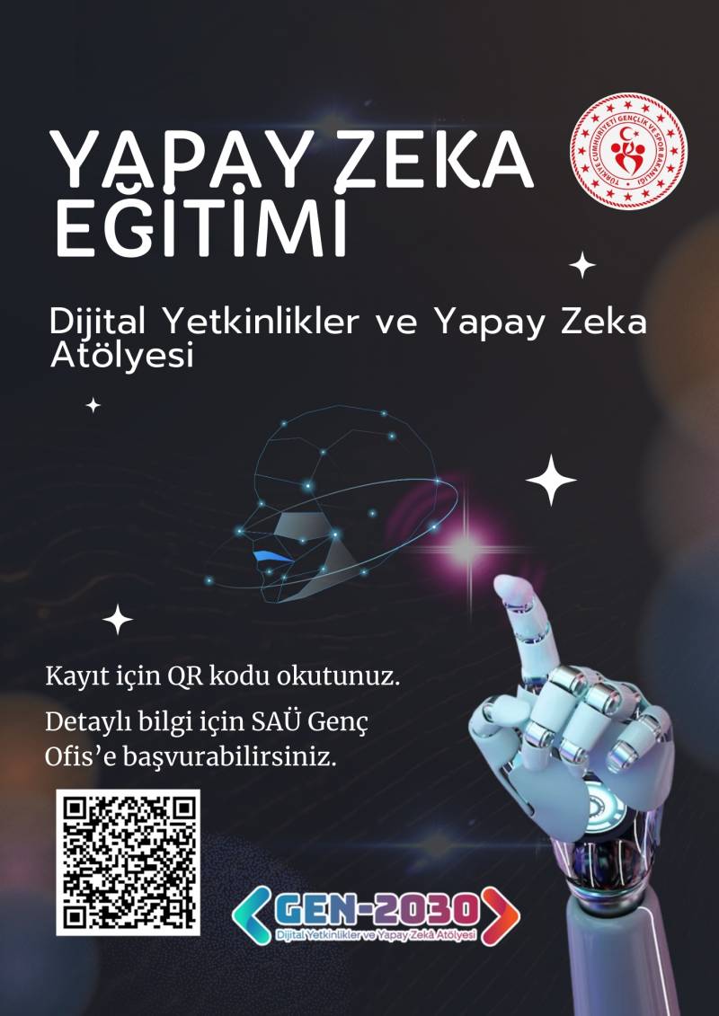 Gençlik ve Spor Bakanlığı bünyesinde yürütülen GENÇ2030 Dijital Yetkinlikler ve Yapay Zeka Atölyesi Projesi kapsamında, Üniversitemizin 2. ve 3. sınıf öğrencilerine yönelik uygulamalı bir Yapay Zeka Atölyesi gerçekleştirilecektir.